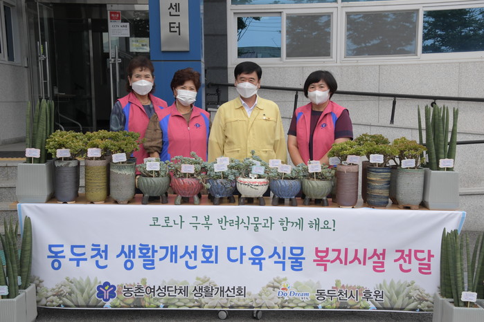 경기 동두천시 생활개선회가 30일 스투키 등 다육식물 180개를 사회복지시설에 전달했다. 40명의 회원으로 결성된 생활개선회는 농가생활의 질 향상을 위한 농촌생활개선사업을 선도적으로 실천하는 농촌여성단체로서 직접 키운 다육식물 180개를 사회복지시설 60곳에 전달했다. 사진은 최용덕 시장(오른쪽 두 번째) 및 관계자들이 기념촬영을 하는 모습. (사진제공=동두천시청)