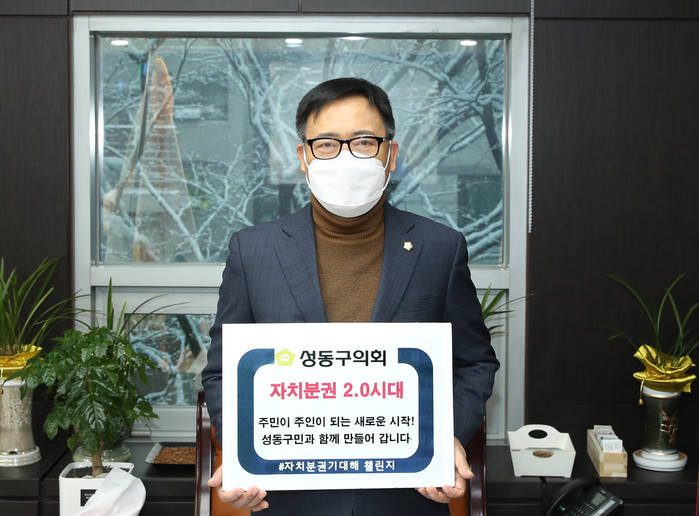 [시민일보 = 홍덕표 기자] 이성수 성동구의회 의장이 12일 정원오 성동구청장의 지명을 받아 자치분권 2.0시대 개막 응원을 위한 '#자치분권 기대해' 챌린지에 동참했다.