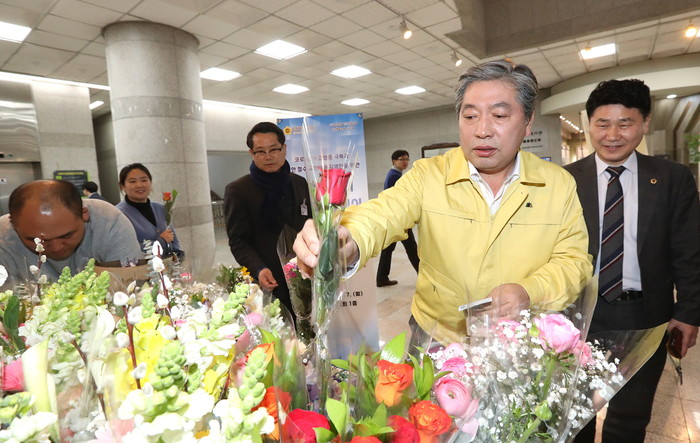 실내에 차려진 행사장도 우리 농산물 구매를 위해 북적이는 도의회 관계자들로 북새통을 이뤘다. 임시 판매대 위에 이천시 로컬푸드 직매장에서 직접 준비한 쌀과 딸기, 사과, 배, 기름, 꽃 등 이천농산물 20여종을 한가득 진열해 두고 판촉에 나선 생산자들과 딸기를 2~3상자씩 들고 가는 의원들, 두부·기름·시래기 등이 가득 든 봉투를 양손 가득 짊어진 직원들의 모습이 어우러져 ‘일일장터’를 방불케 했다.