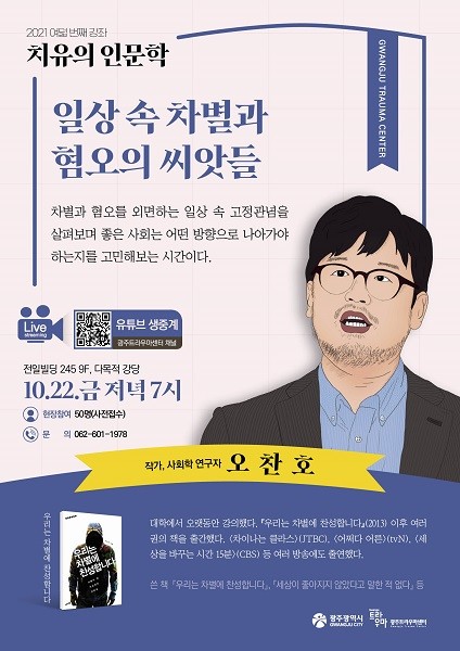 10월 치유의 인문학은 코로나19 사회적 거리두기에 따라 현장인원을 100명이내로 제한하며(접종완료자 50명 포함) 유튜브 채널 ‘광주트라우마센터’를 통해 생중계된다.