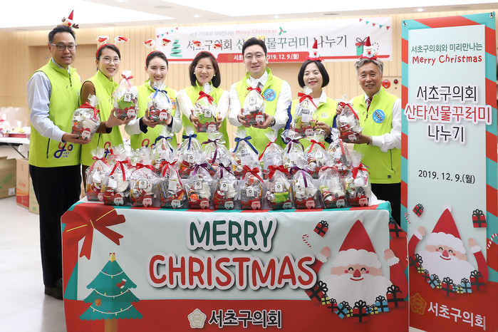 서울 서초구의회가 다가오는 연말을 맞아 본회의장 앞에서 크리스마스 산타가 돼 어린이들에게 줄 먹거리와 학용품을 선물상자에 넣어 직접 255세트의 선물세트를 제작해 지역아동센터 9곳에 전달하는 등 달달한 사랑을 전하기를 실천했다. 사진은 직접 만든 선물세트를 들고 기념촬영을 하고 있는 구 의원들의 모습. (사진제공=서초구의회)