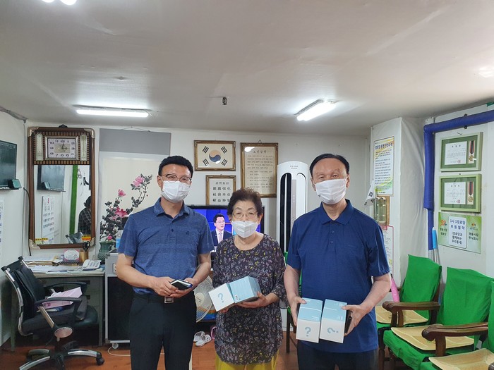 경기 수원시 팔달구 행궁동 행정복지센터는 최근 행궁동 통장협의회 이정숙 20통장과 서정해 25통장으로부터 지역내 홀몸노인 및 경로당을 이용할 노인들에게 전달해 달라며 마스크 3000장을 기탁받았다. 사진은 전달식에서 관계자들이 기념촬영을 하는 모습. (사진제공=팔달구청)