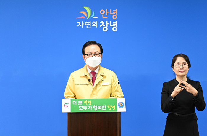 한정우 창녕군수는 8일 군청 브리핑룸에서 코로나19 사회적 거리두기 2단계 격상에 따른 ‘연말연시 잠시 멈춤 캠페인 동참 호소문’을 비대면으로 발표했다.