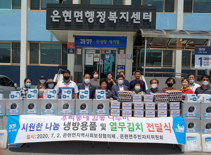 경기 양주시 은현면 지역사회보장협의체와 주민자치위원회는 최근 여름철 폭염을 대비해 지역내 홀몸노인 등 취약계층 32가구에 냉방용품과 열무김치를 전달했다. 사진은 전달식에서 위원들이 기념촬영을 하는 모습. (사진제공=양주시청)