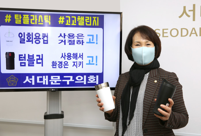 | ▲ 박경희 의장이 플라스틱 사용을 줄이기 위한 캠페인 '고고 챌린지'에 참여하고 있다. (사진제공=서대문구의회) |