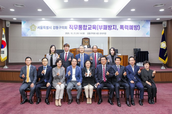 | ▲ 부패방지 및 폭력예방 특강을 들은 후 기념촬영을 하고 있는 구의원들. (사진제공=강동구의회) |