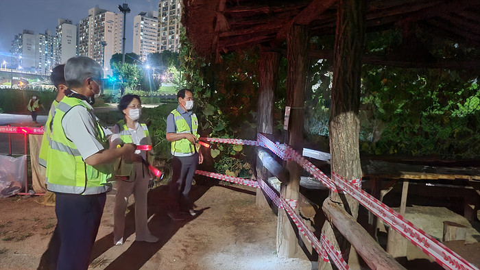 서울 양천구는 최근 코로나19 확산 저지를 위해 동주민센터와 자율방범대로 이뤄진 민관합동 순찰단을 구성해 공원내 음주금지 및 방역수칙 이행 여부를 일일점검하고 있다. 사진은 최근 양천구 민관합동순찰단이 안양천공원내 음주금지 현장 점검하는 모습. (사진제공=양천구청)