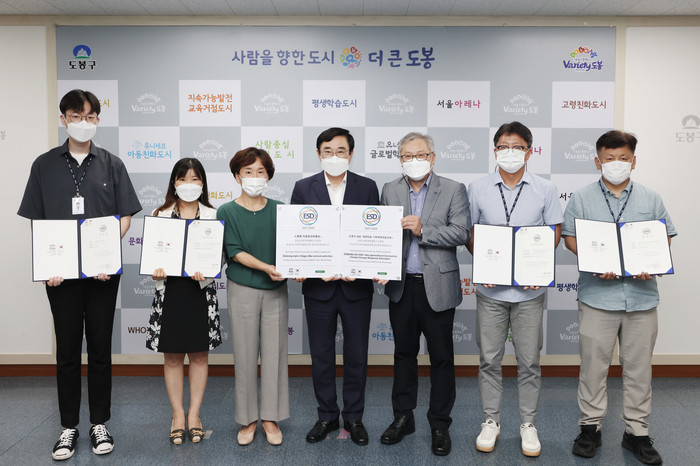 서울 도봉구의 '도봉형 마을방과후활동'과 '세대이음 기후변화대응교육' 사업이 오는 2024년 7월19일까지 3년간 유네스코 지속가능발전교육(ESD) 공식 프로젝트로 재인증돼 18일 새로이 인증된 현판과 인증서를 전달받았다. 사진은 전달식에서 이동진 구청장(가운데)과 관계 직원들이 기념촬영을 하는 모습. (사진제공=도봉구청)