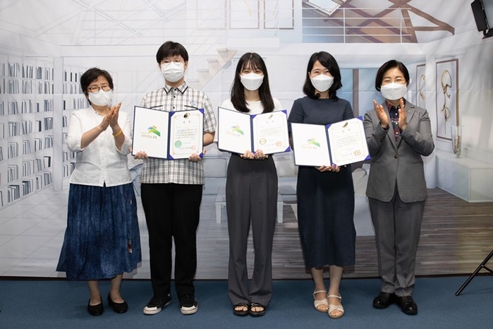 서울 은평구는 지난 24일 ‘제2회 은평구 인권공모전 시상식’을 개최했다. 이번 공모전은 ‘세계적으로 전염병이 대유행하는 상황에서 인권과 관련되어 얻은 교훈’ 등을 주제로 총 83편이 접수돼 심사를 거쳐 모두 18편의 작품이 수상작으로 선정됐다. 사진은 시상식에서 김미경 구청장(오른쪽)과 수상자들이 기념촬영을 하는 모습. (사진제공=은평구청)