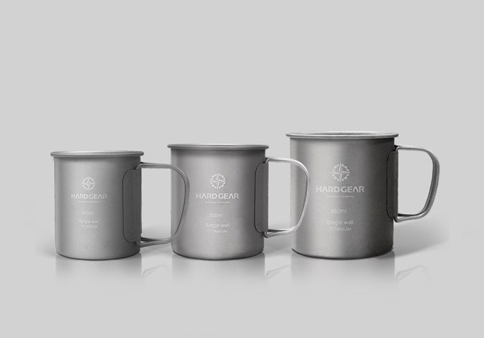 하드기어의 ‘티타늄 컵 시리즈’는 소주잔 50ml, 머그컵 200ml, 300ml, 450ml, 600ml, 시에라컵 300ml가 있다. 티타늄 컵은 일반 스테인레스 컵에 비하여 가볍고 뛰어난 내구성을 자랑하며 특히 하드기어의 티타늄 소주잔의 경우, 더블월로 제작되어 보온/보냉 효과가 좋아 온도 유지 시간이 길고 우수하다.