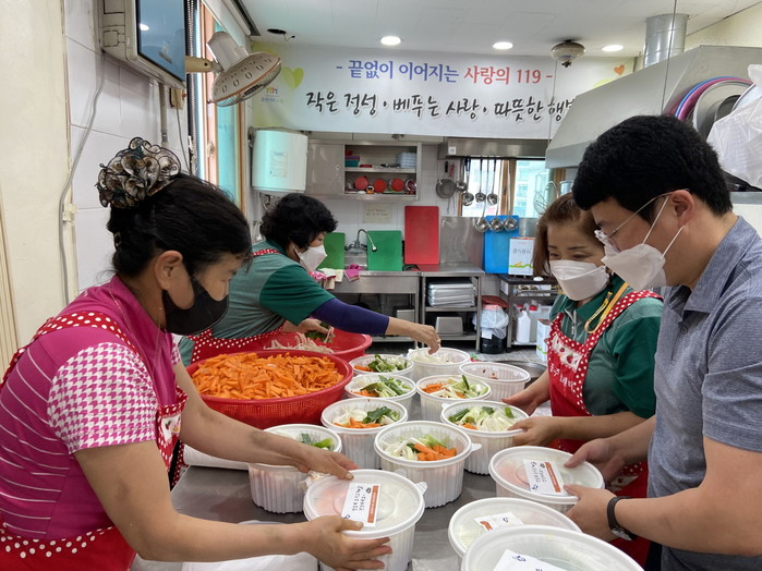 경기 수원시 권선구 평동 새마을부녀회는 지난 28일 사랑의 반찬 나누기 행사를 열어 회원들이 정성들여 만든 제육볶음을 지역내 취약계층 45가구에 전달했다. 사진은 이날 봉사자들이 제육볶음을 포장하고 있는 모습. (사진제공=수원시청)