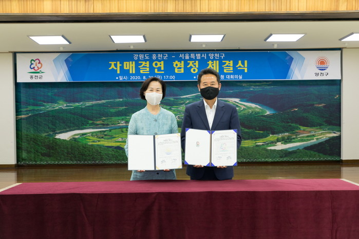 서울 양천구는 지난 21일 강원도 홍천군과 자매결연 체결 협약식 개최했다. 이번 협약을 통해 양천구와 홍천군은 도·농 간 협력증진 등 다양한 분야에서 상호발전을 도모한다. 사진은 김수영 구청장(왼쪽)이 허필홍 군수와 함께 협정서를 들고 기념사진을 촬영하고 있는 모습.(사진제공=양천구)