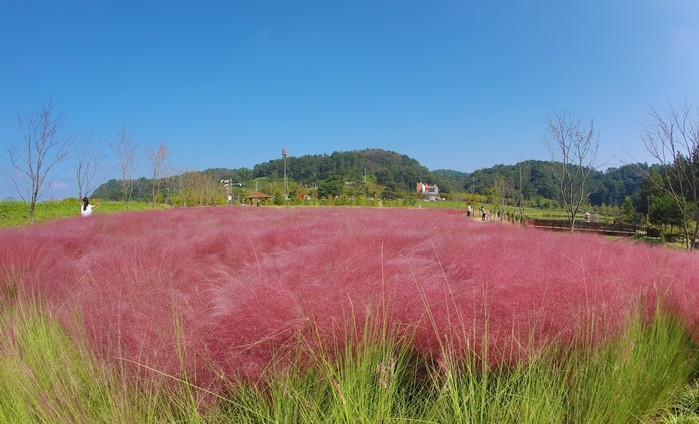 코스모스와 4600여 ㎡의 핑크뮬리 들판이 분홍색 가을바람으로 일렁인다.