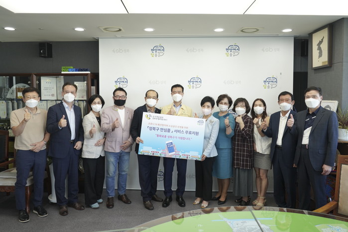 서울 성북구는 18일 코로나19 재확산으로 어려움을 겪고 있는 지역내 다중이용시설 사업자들을 위한 080 무료 안심콜 도입 논의를 위해 성북구 다중이용시설 대표자 간담회를 열었다. 사진은 이날 이승로 구청장(가운데)과 관계자들이 기념촬영을 하는 모습. (사진제공=성북구청)