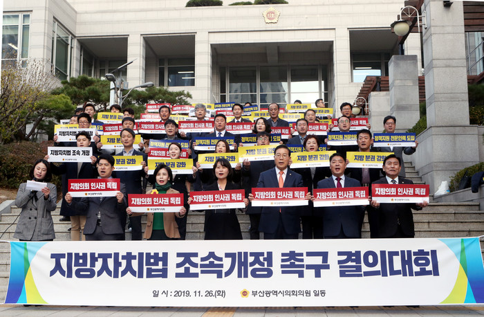 부산시의회 의원들은 26일 오전 부산 연제구 시의회 정문에서 '자치분권 강화와 지방의회 독립성 확보를 위한 지방자치법 조속 개정'을 촉구하며 구호를 외치고 있다.