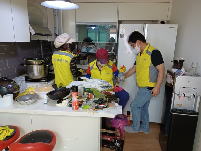경기 이천시자원봉사센터는 지난 24일 사음동에 거주하는 베트남 다문화가정에 대해 정리수납봉사단과 연계해 해충방역 및 청소 등 주거환경 개선사업 봉사활동을 펼쳤다. 사진은 이날 봉사자들이 대상 가구에서 해충방역 및 청소를 하고 있는 모습. (사진제공=이천시청)