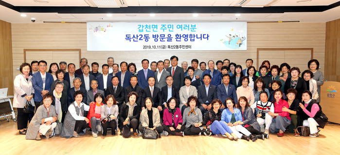 서울 금천구 독산2동 주민자치회와 동주민센터가 최근 자매도시인 강원 횡성군 갑천면 주민자치위원회 및 지역주민들을 초청해 우호교류행사를 개최했다. 사진은 행사에 참여한 유성훈 구청장(가운데) 및 관계자들이 기념촬영을 하는 모습. (사진제공=금천구청)