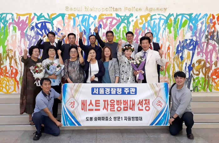 서울 도봉구 쌍문1동 자율방범대는 최근 서울지방경찰청에서 개최하는 ‘2019년 2/4분기 베스트 협력단체’ 시상식에서 서울지방경찰청장으로부터 베스트 자율방범대 인증서를 수여받았다. 사진은 인증서를 수여받은 후 기념촬영을 하는 모습. (사진제공=도봉구청)