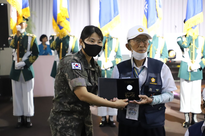 서울지방보훈청은 최근 세빛섬 플로팅아일랜드 컨벤션에서 6.25전쟁 70주년을 기념해 '한강방어선 전투 기념식 및 6.25참전유공자 초청 위로연'을 개최했다. 사진은 6.25참전유공자에게 감사메달을 증정하는 모습. (사진제공=서울지방보훈청)