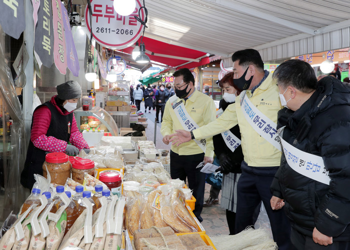 경기 광명시의회가 설 명절을 앞두고 8일 코로나19 장기화에 따른 소비심리 위축으로 어려움을 겪는 전통시장에 활력을 불어넣기 위해 '물가체험 및 장보기 행사'를 개최했다. 이날 의장단은 제수용품 등을 '온나라 상품권'으로 구매하면서 상인들의 애로사항을 청취했다. 사진은 박성민 의장과 박덕수 부의장이 장을 보며 상인들과 소통하는 모습. (사진제공=광명시의회)