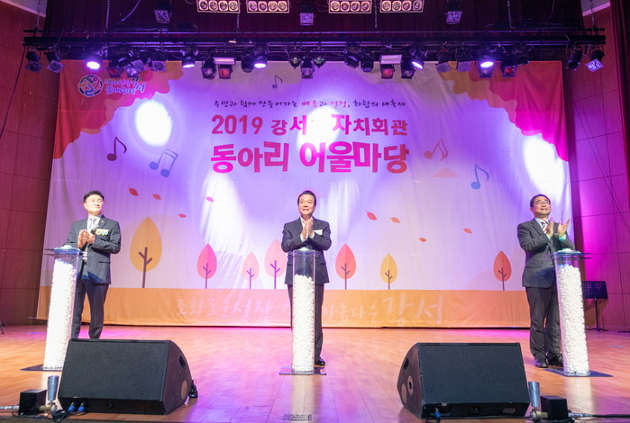 서울 강서구는 24일 강서구민회관 우장홀에서 주민과 함께 만들어가는 배움과 열정, 화합의 대축제인 ‘자치회관 동아리 어울마당’을 개최했다. 사진은 노현송 구청장(가운데)과 관계자들이 어울마당 개최를 알리고 축하하는 모습. (사진제공=강서구청)