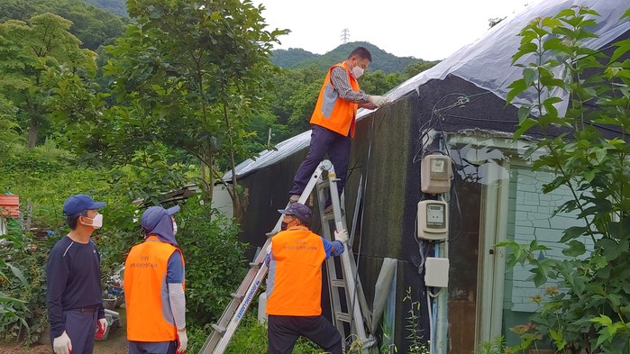 경기 광주시 탄벌동 지역사회보장협의체는 최근 회덕동 산비탈에 위치한 비닐하우스내 컨테이너에 거주하는 조손가정의 지붕 개보수를 위한 나눔 봉사활동을 펼치고 제습기 등 여름용품을 후원했다. 사진은 이날 봉사자들이 대상가구의 지붕을 수리하고 있는 모습. (사진제공=광주시청)