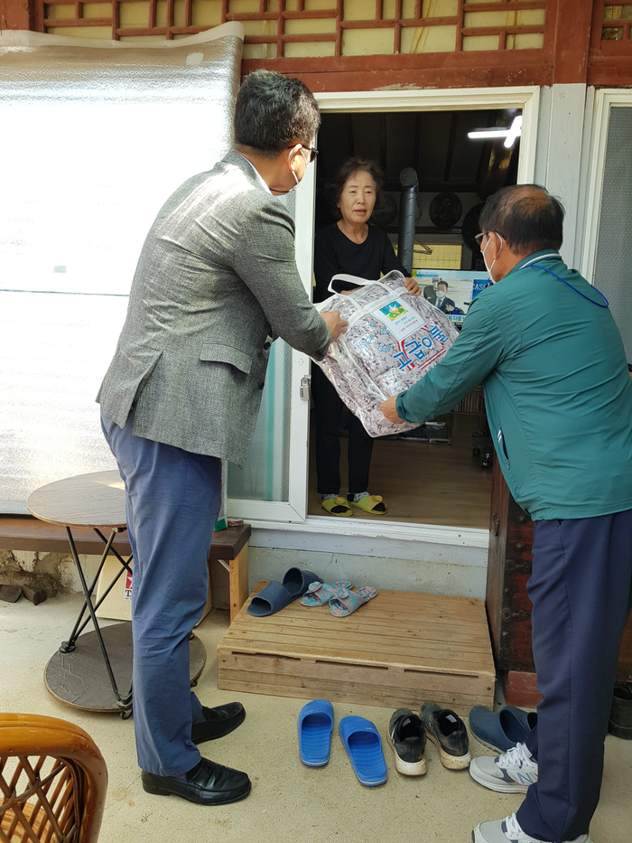 인천 강화군 선원면 지역사회보장협의체가 최근 포근한 봄이불 나눔 행사를 열어 이불을 구매하기에 어려움이 있는 거동불편 노인과 장애인들에게 이불을 지원했다. 사진은 협의체 관계자들이 노인 가구를 방문해 이불을 전달하고 있는 모습. (사진제공=강화군청)