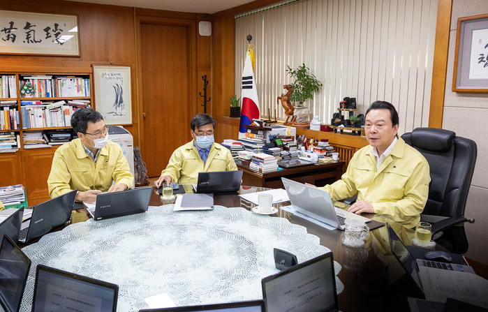 노현송 서울 강서구청장이 지난 28일 오전 10시 구청장실에서 국장과 소관부서장들과 함께 '코로나19 대책회의'를 했다. 이날 노 구청장은 구 보건소장으로부터 '강서중앙데이케어센터' 관련 감염 상황을 보고 받고 주민들의 불안감 해소를 위해 총력을 다해달라고 주문했다. 사진은 회의 진행 모습. (사진제공=강서구청)