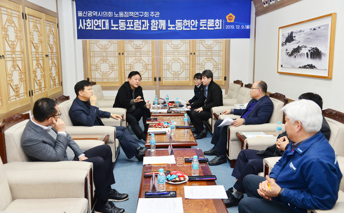 울산시의회 의원연구단체 ‘노동정책연구회’는 9일 시의원, 울산사회연대 노동포럼 관계자 등이 참석한 가운데 '이동노동자 쉼터 조성' 을 주제로 토론회를 열었다. 사진은 이날 토론회에서 노동자 근무여건 개선에 대해 논의하는 모습. (사진제공=울산시의회)
