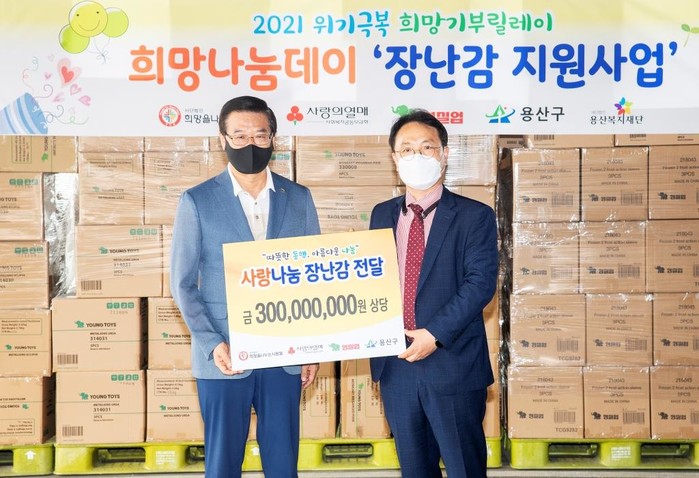 서울 용산구는 지난 8일 (사)희망을나누는사람들으로부터 (주)영실업에서 후원받은 물품인 어린이 장난감 1500상자(3억원 상당)를 기탁받았다. 구는 이 물품을 지역내 조손·다문화·한부모가정 등에 전달할 예정이다. 사진은 기탁식에서 성장현 구청장(왼쪽)이 관계자와 기념촬영을 하는 모습. (사진제공=용산구청)
