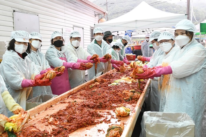 경기 광주시 탄벌·송정동 주민자치위원회는 최근 이틀간 ‘2021 탄벌·송정동 사랑 나눔 여름김치 담그기’를 개최해 지역내 취약계층 100가구에 전달했다. 사진은 이날 행사에 참여한 신동헌 시장(왼쪽에서 네 번째)과 봉사자들이 김치를 만들고 있는 모습. (사진제공=광주시청)