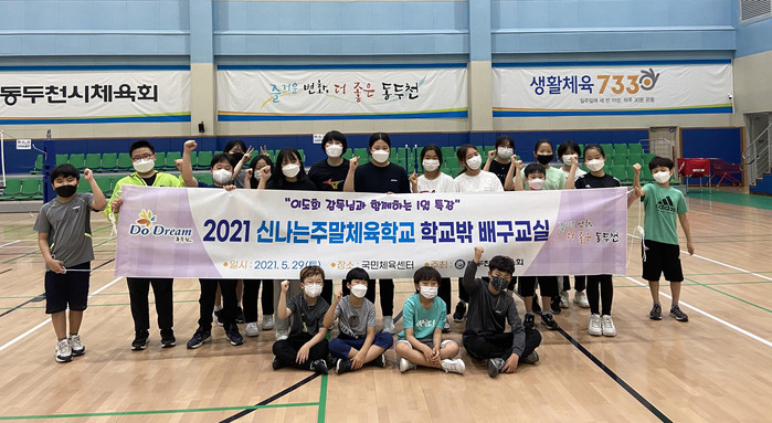 경기 동두천시체육회는 최근 초등학생(4~6학년) 20여명을 대상으로 현대건설 힐스테이트 배구단 이도희 전 감독을 초청해 '1일 배구교실'을 진행했다. 이날 수업에서는 배구의 기본자세인 언더토스와 스파이크 등의 방법 및 자세를 익혔다. 사진은 1일 배구교실 참가학생들과 이 전 감독이 기념촬영을 하는 모습. (사진제공=동두천시청)