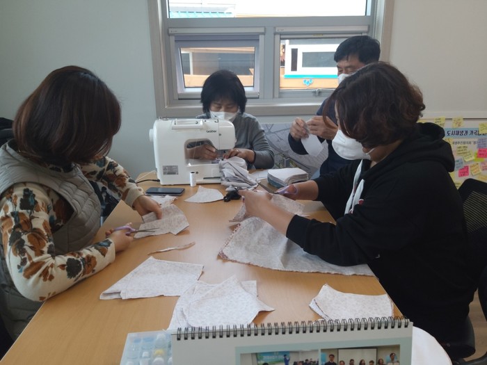 가곡동도시재생추진협의회는 지난 24일부터 다양한 무늬의 천과 유기농 면을 구입하여 밀아클(밀양아지매클럽) 회원들의 도움을 받아 마스크를 제작했다.