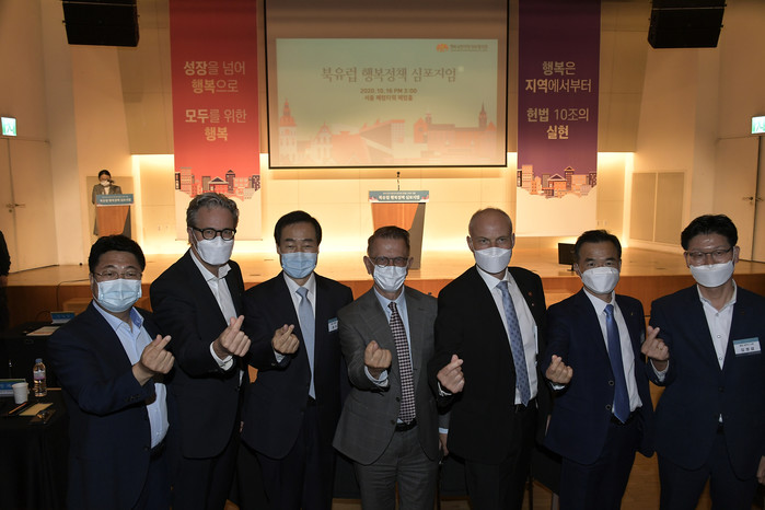 문석진 서울 서대문구청장이 지난 16일 ‘북유럽 행복정책 심포지엄’에 참석했다. ‘행복실현지방정부협의회’ 창립 2주년을 기념해 열린 이날 행사에는 덴마크·스웨덴·핀란드 등 북유럽 3개 나라의 주한 대사가 토론자로 참석했다. 사진은 문 구청장이(왼쪽 세 번째) 토론자들과 함께 손가락 하트를 만들어 보이며 기념촬영을 하는 모습. (사진제공=서대문구청)