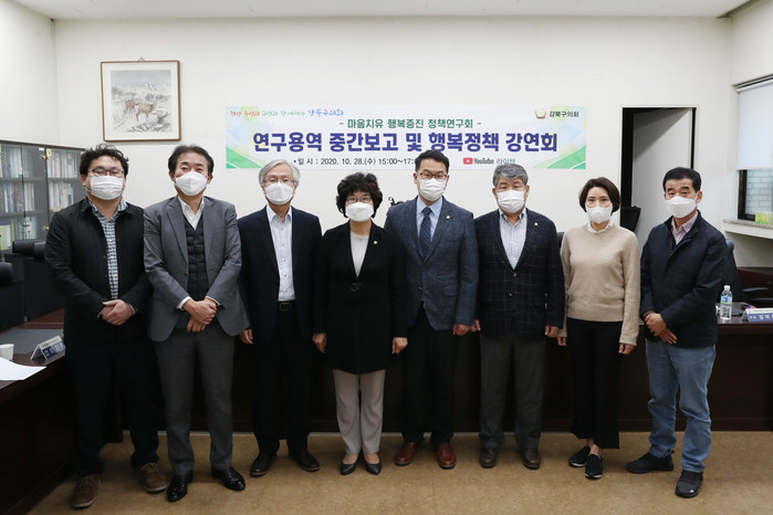 [시민일보 = 홍덕표 기자] 서울 강북구의회(의장 이용균) 마음치유·행복증진 정책연구회가 최근 구의회 3층 의원회의실에서 '행복지표 개발·정책연계 방안 연구용역 중간보고 및 지방정부 행복정책 필요성'을 주제로 온라인 강연회를 개최했다.