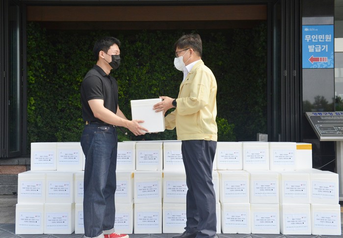 경기 수원시 영통구는 20일 중복을 맞이해 지역의 홀몸노인 등 어려운 이웃 120가구를 위해 삼계탕 등이 담긴 ‘사랑의 보양식 꾸러미 나눔행사’를 열었다. 이 행사는 지역내 단체·기업·지역주민 등이 공동모금회를 통해 전달한 성금으로 마련됐다. 사진은 전달식에서 김용덕 구청장(오른쪽)이 보양식 꾸러미를 전달하고 있는 모습. (사진제공=영통구청)