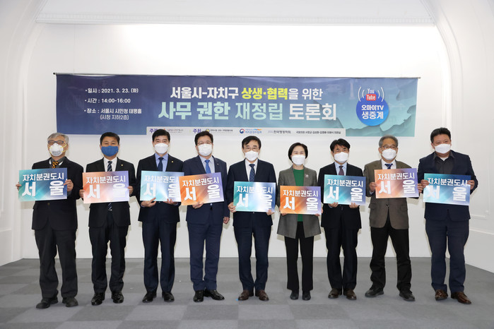 서울시구청장협의회가 주관하고 전국시장군수구청장협의회 등이 공동 주최한 ‘서울시-자치구 상생·협력을 위한 사무권한 재정립 토론회’가 23일 개최됐다. 토론회는 개회식·학술 발표·종합토론 순으로 진행됐으며 유튜브로 생중계됐다. 사진은 이동진 서울시구청장협의회장(도봉구청장·가운데)과 참석자들이 기념촬영을 하는 모습. (사진제공=도봉구청)