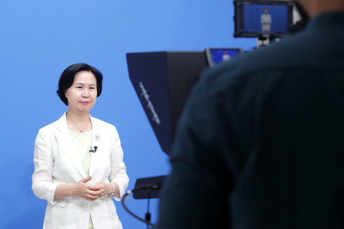 김수영 서울 양천구청장이 최근 ‘소공여(소통·공감·참여)’ 브리핑의 네 번째 촬영을 했다. 소공여 브리핑은 매주 월요일 한 주간 구민들에게 필요한 소식 및 정보를 김 구청장이 직접 소개하는 코너로, 이달부터 유튜브 '양천TV'에 업로드하고 있다. 사진은 김 구청장이 양천디지털미디어센터에서 소공여 브리핑 영상을 촬영하고 있는 모습. (사진제공=양천구청)
