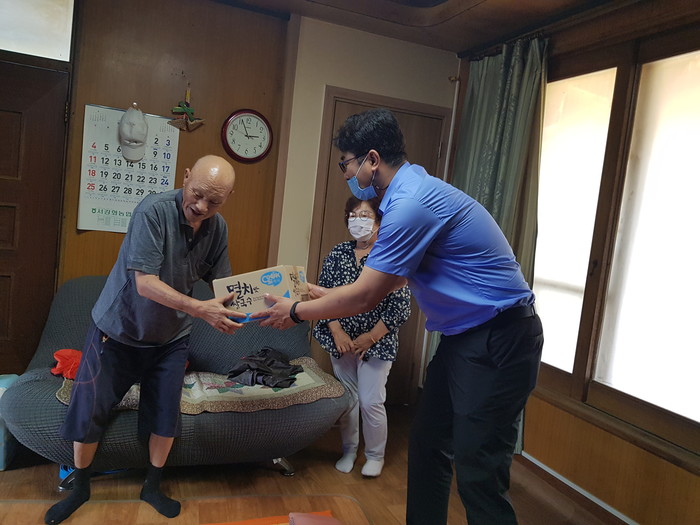 인천 강화군 화도면 7개 단체(이장단·새마을부녀회·주민자치위원회·지역사회보장협의체·농가주부모임·적십자부녀회·생활개선회)는 최근 코로나19 장기화로 급식 지원에 어려움을 겪고 있는 저소득층 홀몸노인 및 장애인 가구를 방문해 안부를 확인하고 사랑의 쌀국수를 전달했다. 사진은 대상 가정에 쌀국수를 전달하는 모습. (사진제공=강화군청)