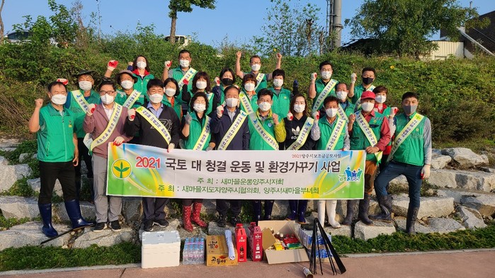 경기 양주시 새마을지도자은현면협의회와 은현면새마을부녀회는 지난 2일 지역내 주요 도로와 신천 일대 둔치 지역에서 국토 대청결운동 및 신천에 하천 정화를 위해 미꾸라지 1000여마리를 방류하는 사업을 전개했다. 사진은 이날 봉사자들이 기념촬영을 하는 모습. (사진제공=양주시청)