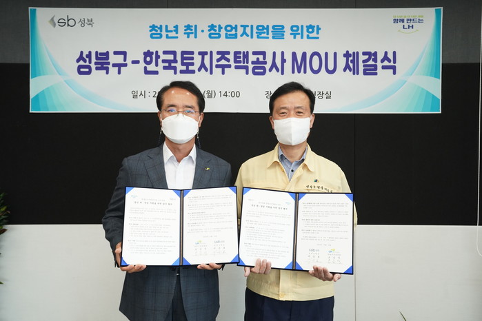 서울 성북구가 한국토지주택공사(LH)와 청년 취·창업 역량강화 및 커뮤니티 활성화를 위해 지난 12일 업무협약을 체결했다. 양 기관은 협약을 통해 청년 주거 안정과 취·창업 역량 강화, 커뮤니티 활성화를 위해 힘을 모으기로 약속했다. 사진은 협약식에서 이승로 구청장(오른쪽)과 오승식 본부장이 기념촬영을 하는 모습. (사진제공=성북구청)