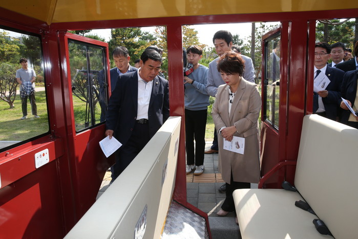 이에 최영옥 문화복지위원회 위원장 및 소속 의원들은 팔달산 코스를 시범운행하는 신규 화성어차의 기본 제원에 대한 설명을 청취한 뒤 직접 탑승해 운행 점검을 실시했다.