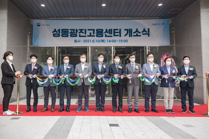 김선갑 서울 광진구청장이 최근 성동·광진 고용복지+센터 개소식에 참석했다. 센터에는 고용노동부 서울동부지청, 광진구, 성동구 등 6개 기관의 직원이 근무하며 일자리·복지상담은 물론 실업급여, 국민취업지원제 등 다양한 서비스를 제공하고 있다. 사진은 개소식에서 김 구청장(왼쪽에서 다섯 번째)이 관계자들과 테이프 커팅을 하는 모습. (사진제공=광진구청)