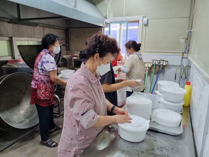 경기 광주시 초월읍 서하리 새마을회는 최근 무더위와 코로나19로 지친 노인들을 위해 ‘복날 맞이 어르신 닭백숙 나눔 행사’를 열어 노인 70여명 가구로 직접 만든 닭백숙을 전달하고 안부를 살폈다. 사진은 이날 봉사자들이 닭백숙을 포장하고 있는 모습. (사진제공=광주시청)
