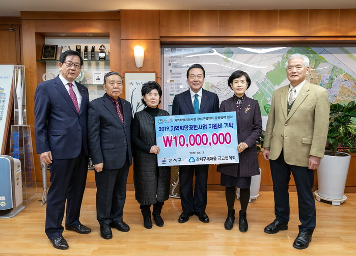 서울 강서구는 17일 구청장실에서 지역내 새마을금고 5곳으로부터 지역희망공헌사업 지원금 1000만원을 기탁받았다. 사진은 노현송 구청장(오른쪽에서 세 번째)이 기탁금을 받은 후 새마을금고 관계자들과 함께 기념촬영을 하는 모습. (사진제공=강서구청)
