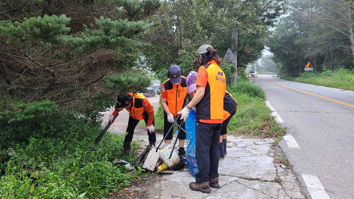 경기 양평군 지평면 여성의용소방대는 지난 31일 지평면사무소부터 월산저수지 인근(총 4.6km 구간)의 도로변 정화활동을 실시해 저수지 주변 등 주요 도로변에 무단 투기된 쓰레기와 폐기물을 수거했다. 사진는 이날 여성의용소방대 대원들이 무단 투기된 쓰레기를 치우고 있는 모습. (사진제공=양평군청)