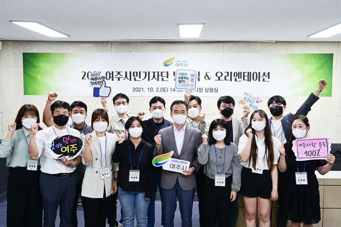 경기 여주시는 지난 2일 ‘2021년 여주시민기자단 발대식 및 오리엔테이션’을 개최했다. 시민기자들은 올해 말까지 시정 현장 등 다양한 분야에 대해 취재하고 기사 작성 등의 활동을 하게 된다. 사진은 발대식에서 이항진 시장(앞줄 가운데)과 시민기자단원들이 기념촬영을 하는 모습. (사진제공=여주시청)