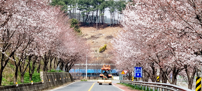21일 의령읍 친환경골프장 벚꽃길과 가례면 자전거도로에는 이미 벚꽃이 활짝 피어 나들이객들이 봄을 만끽하고 있고 봄 농사 준비로 농기계들이 분주히 움직이고 있다.