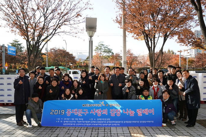 19일 서울 동대문구가 KT&G복지재단동부복지센터, 지역내 복지관, 노인지원센터, 지역아동센터 등 총 9개 기관 관계자 60여명이 함께 ‘2019 동대문구 사랑의 김장 나눔 릴레이 행사’를 실시, 지역내 어려운 이웃에게 김장김치를 전달했다. 사진은 T&G복지재단 동부복지센터가 김장김치를 전달하고 관계자들과 기념촬영을 하고 있는 모습. (사진제공=동대문구청)