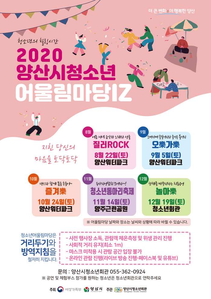 양산시청소년어울림마당은 양산시와 여성가족부 주최, 양산시청소년회관 주관 행사로 9월 5일 종합공연 및 체험부스 [오樂가樂] , 10월 24일 댄스공연 [즐겨樂], 11월 14일 [청소년동아리축제], 12월 19일 종합공연 [놀아樂]으로 계속된다.